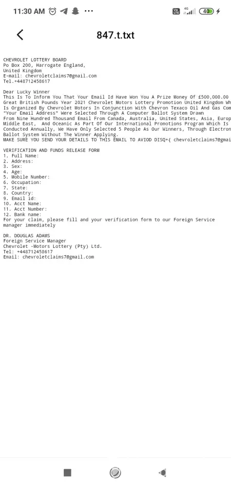 According to your file record; your payment is categorized as: Contract type: Lottery/inheritance/Undelivered Lottery fund/