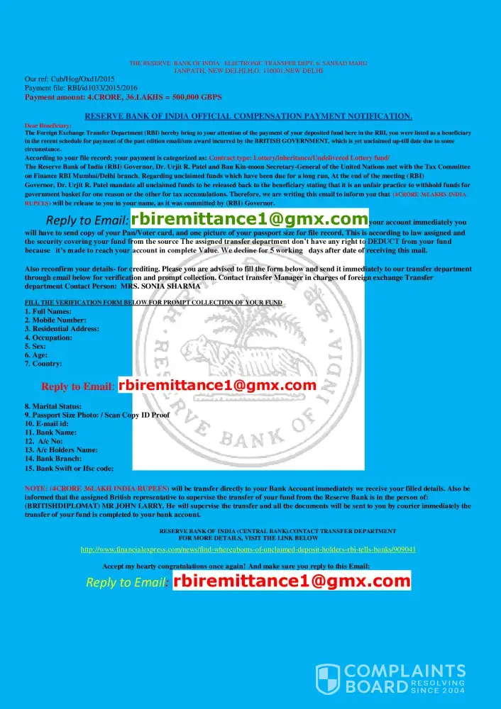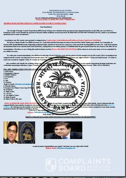 The foreign exchange transfer department (Rbi) hereby bring to your attention of the payment of your deposited fund here in the rbi, you were listed as a beneficiary in the recent schedule for payment of the past edition email/sms award incurred by the british government/world bank, which is yet unclaimed up-till date due to some circumstance