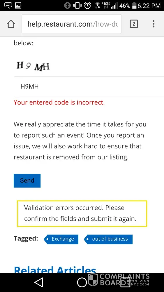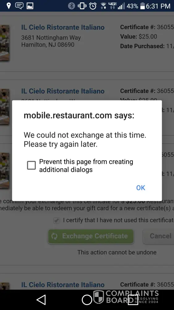 Please help? Ive tried the web page over 20 times and ive called a dozen times. And nothing! I have eight certificates that all are to permanently closed restaurants. Ive tried to "exchange" these through the web site but it never worked. I typed everything precisely as it should be and it tells me the code i typed for proof im not a robot is always incorrect. I have attach pics so you can clearly see that is wrong! I emailed and only received a generic "how to exchange" reply. It's not working! Therefore, generic responses do nothing. I tried to call and your customer service phone number is outside my calling area! Wtf is that?!?!? I just want a human to try and understand my frustration. Your app and web page blow! I need real help! From a human being! What an unbelievable hassle this is!