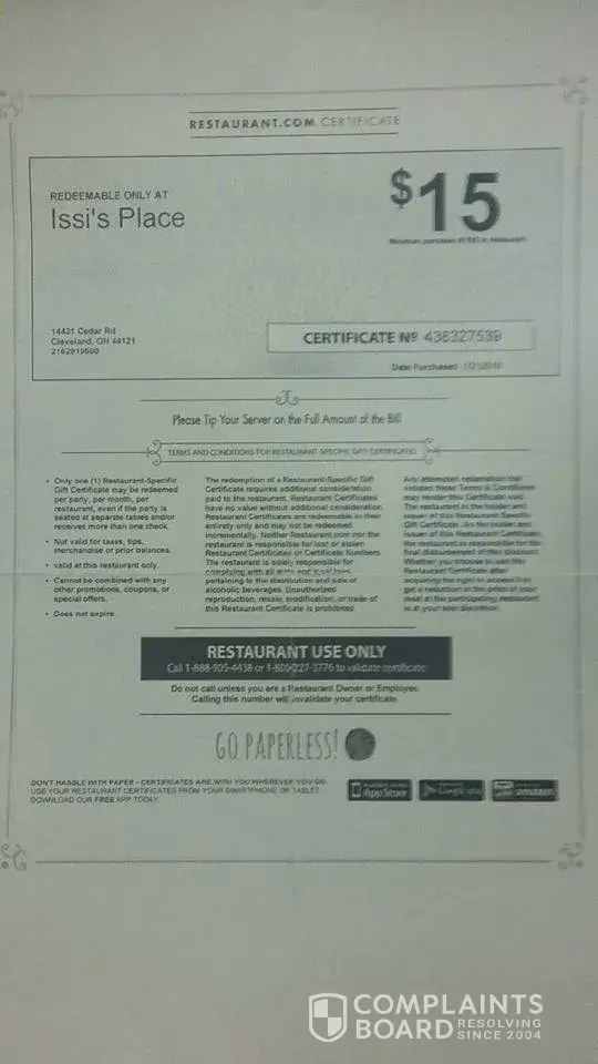Purchased a certificate to a restaurant that refused to honor it. Restaurant staff said Restaurant.com never asked for permission and the restaurant never signed up. What a ripoff...