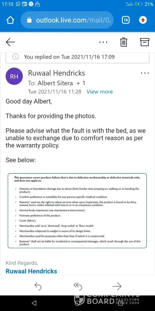 i purchased a restonic bed "Bolero" from bears furnishers here in vredenburg in August the 20th the first few days of using bed we found the bed to be causing us body pains, i contacted Bears furnishers and explained whats happening, they in turn gave me a contact person at Restonic Named Miles, as discussed with him the problem i was told by him to use the bed for s month and see if there is any changes after a month passed by we tried to contact Miles again but no answer from him after the lady from bears contacted head office only then did he respond and contacted me, he came out Yesterday the 19th of October, he was here for 10 minutes and says that there is nothing wrong with the bed, 'HOW DOES ONE TEST A BED BY JUST SITTING ON THE EDGES TO TEST THE SPRINGS"