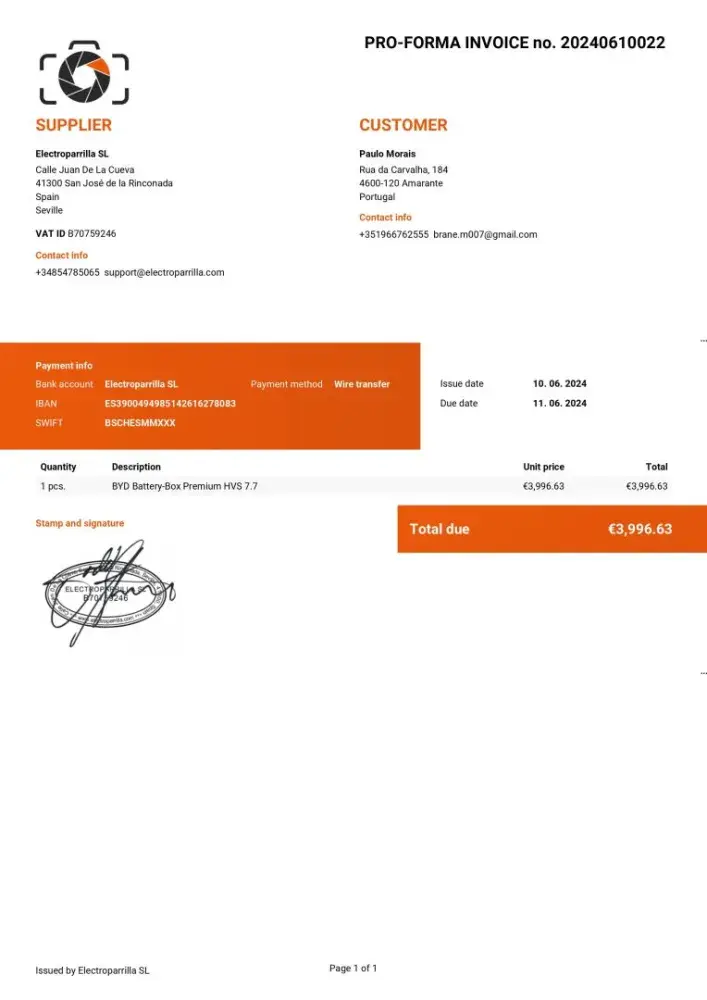 I recently had a concerning experience with ElectroParrilla.com that I believe others should be aware of. I purchased a BYD Battery-Box Premium HVS 7.7 for €3501.18, thinking it was a legitimate transaction. However, after completing the purchase, I noticed several warning signs indicating that the site might not be trustworthy. The company's addre...