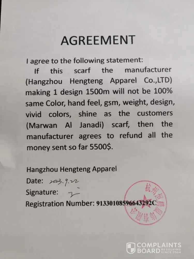Hangzhou Hengteng Apparel Co., Ltd. Is a scammer business. On Alibaba, They tricked me in to paying them 30% (5666$) of an order promising they will make my scarf 100% as I requested and they sent me a scarf that was not respecting the requirements I asked for. When I asked for a refund as we agreed in the Official Agreement he signed and stamped, he...