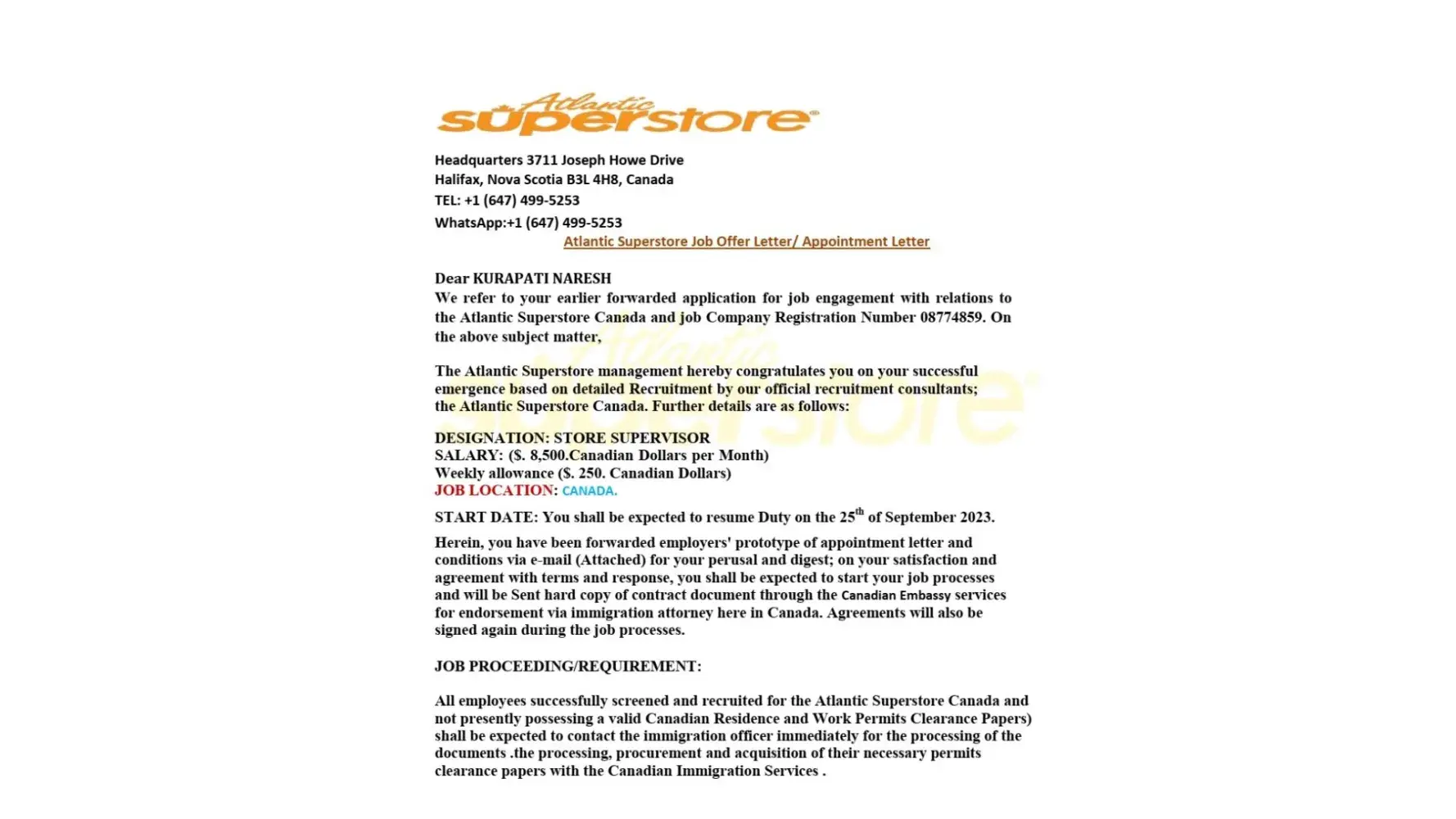 Atlantic Superstore Canada Headquarters:3711 Joseph Howe Drive Halifax, Nova Scotia B3L 4H8 Canada TEL: +[protected] WhatsApp:+[protected] Dear KURAPATI NARESH This is an affirmation that your experience and qualifications were found successful for the requirements of Atlantic Superstore Canada, Also as an Employee of Atlantic Superstore Canada...