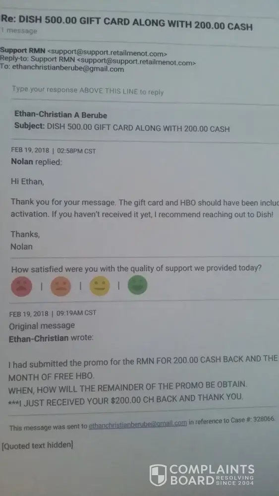I aquire services through rmn for a dish network program. The product code vcd0018724559 which offered $500. 00 gift card and free hopper service etc. Now I received your end of $200.00 cash back.in several contacts with rmn they stated it was a rogue add placed on its site? How can a rogue ad appear on your site? And more importantly your not going to offer what the ad states from your site. Dish states it is not their responsibility for the ad on your site.
