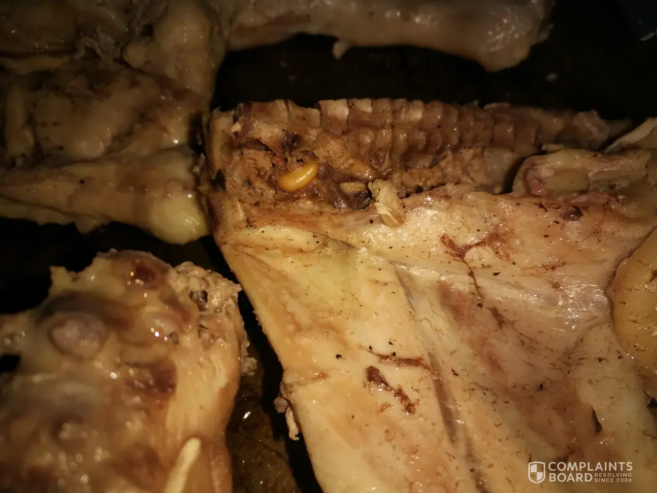 Found what appears to be worms on chicken that came out of a bag of chicken leg quarters. They are not moving but found on cooked pieces and on some still raw. Bag was frozen on Friday within the hour after buying. Defrosted over night in fridge. When I cut the bag open this morning half was still frozen so I boiled the defrosted ones and put the rest back...
