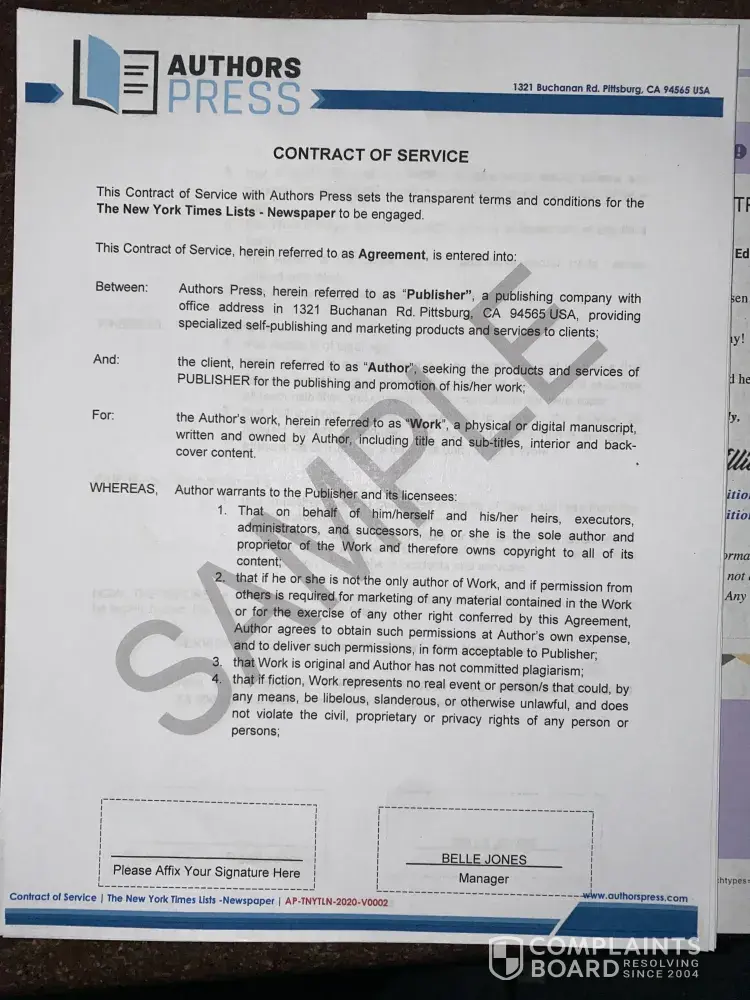 After reading complaints from here and BBB, it was clear to me that Authors Press is skilled at collecting money upfront, while attempting to demonstrate their legitimacy by spending a tiny amount of money to print their invoice and contract on fancy paper, all the while also trying to talk their way out of responsibility for major financial losses of individuals that attempted to benefit from their "services". However, when you looked closely, for a publishing company, the typos and incorrect grammar should be a red flag for any author or writer.