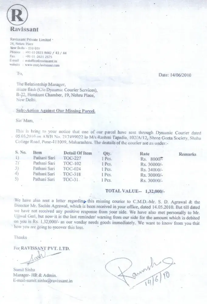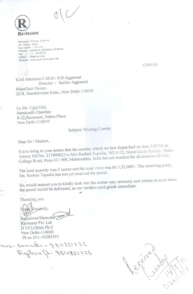 Till 15/05/2010 while Pune office kept telling receiver that train was in accident (derailed) and blah blal, Delhi office fabricated a story of parcel stolen from Railways. Neither is found to have substance.