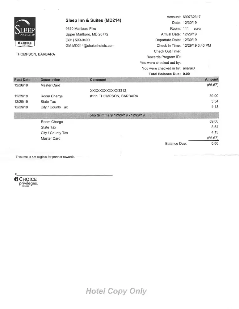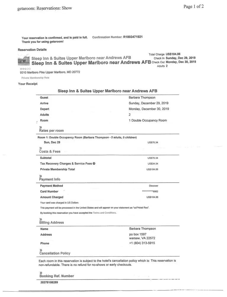 I spoke with Choice Hotel reservation line to book a room at the Sleep Inn & Suites in Upper Marlboro, Md. on 12/26/19 using a Discover card. I was sent a confirmation for $104.88 as the cheapest available room and was told this room was already discounted so no AARP or AAA could be applied. CCI Hotel Reservations charged my card the $104.88 but when I got to the hotel to register I was told I booked with Priceline.com and the receipt showed a Mastercard ending in 3312 for $66.67. I do not own a Mastercard. CCI Hotel Reservations has ripped me off for $38.21.