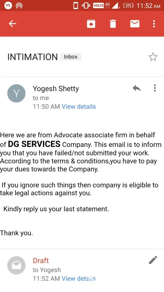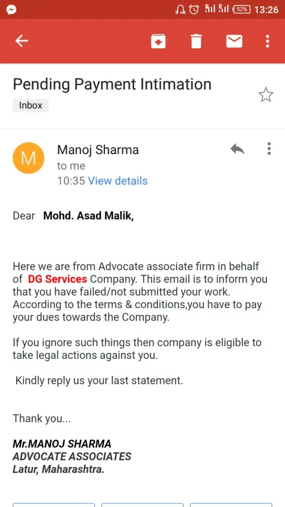 As on 3rd September 2018, I received an intimation mail from arju.[protected]@gmail.com who claimed to be the Advocate associate firm of DG Services. The mail was intimation for me to pay the dues towards the company or else they will be eligible to take legal action on me.