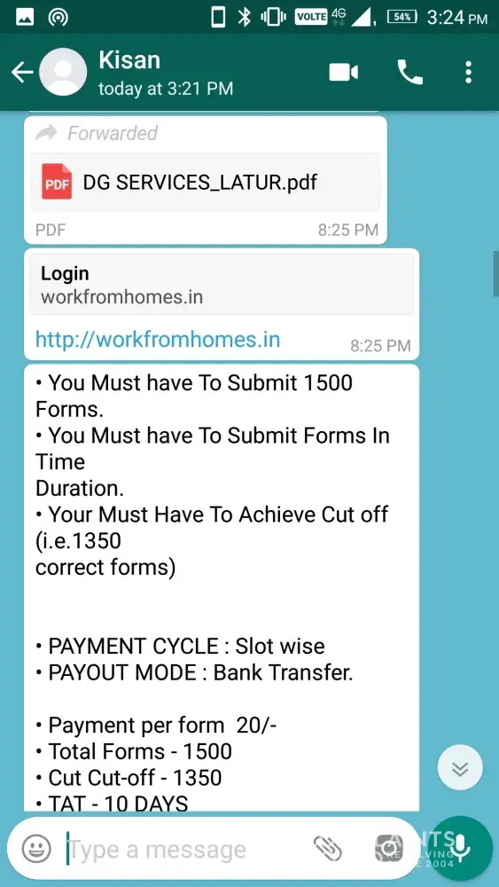 Sir A company Named DG Services that is from latur maharastra is a form filling company. A sms came from their Company to my mobile for form filling job they said me to send them a address proof document and I sent him and then they made a agreement on a non judiciary stamp of my name as second party and their own as second party. Then they sent me a user id or password and sent me a website link of https://goo.gl/7mp53L named work from homes and i logged into it i completed a about 400 pages and afterwards I was not able to complete the form so i quited their work now a person called me telling he is calling from district court legal department he is telling me that a legal case has been registered through DG Services comp they saying that i have not completed the data filling on time. They saying that according to agreement i have to pay 4900 they are saying me to pay 4800 reg amount + 1950 legal charges + 850 noc charges and total amount they are demanding me to pay is Rs. 7600 they are telling me that If you are not paying this amount before 5 pm they will Impose legal acts on you and you will have to pay Rs. 40000 in District Court Please check this whole matter
