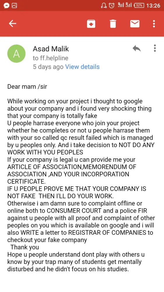 Sir a company Named DG SERVICES that is from Latur Maharastra is a form filling company and helpline email ID : ff.helpline@gmail.com and helpline contact no [protected]. One of their Employee once call me and said offering you a form filling job sent me a adder proof document and I sent him and then they made a agreement on a non Judiciary stamp of my name as second party and their own as second party. Then they sent me a user id or password and sent me a website link named workfromhomes.in with their conditions, and they assigned me 1500 forms for form filling work 10 days time, which completed within 7 days itself due to my typing speed of 50 wpm and with 98% accuracy, so I know my capability and accuracy of my job, but when I completed and submitted my work on 7th day date next day itself I got replied that your qc result are now in website when I went and checked with website I found its mentioned qc results failed, but the data which I typed and which they sent in qc results both differs and showing more errors .now they are demanding money within nest day of submission of there qc result and continuously calling, SMS to pay money and when I googled and search the details regarding this company I found lot of people already filed complaint against the above mentioned company, after that a advocate of them contact me and demand money from me . And threatened me that if I don’t give money to them then they will file a case against me . I got a mail dated on 28 /08/2018 stating we legal department DG services hereby having your case for QC Fail of work by the advocate named AJAY GOEL, Surat, Gujarat, contact no: [protected]. And threatened me that make payment of RS. 8620, provide the screenshot of successful payment on this email ID associationadvocate.legaldepart@gmail.com. On the basis of that they will provide me NOC letter and threatened me that If payment is not done then need to pay Rs. 50000 for total loss to his client. It also another advocate named M. PATEL, contact no: [protected] send me a legal notice by an email ID associateadvocate08@gmail.com on 31/08/2018 and demand money within 4 days Rs .4900 + Rs. 2500, Sir I am a student, It is not possible to give money to me. Please help me sir.
