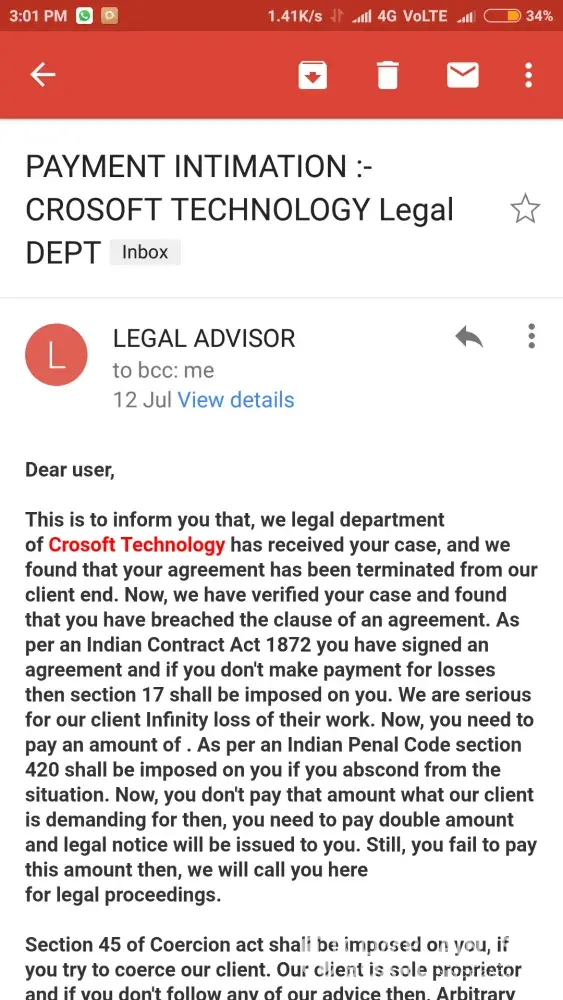 After a day the company replied me and ask for money.. Till now I neither recevd any call mail and msg from company but today a lawyer msg me and mail me and he demands money and give threats of legal procedure.
