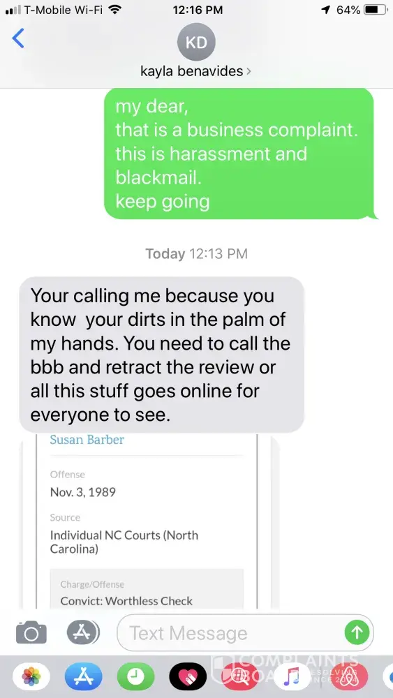 2) sent screenshots of people with our same names criminal charges from all across the country (not us) saying that she will use them to smear our hvac business.