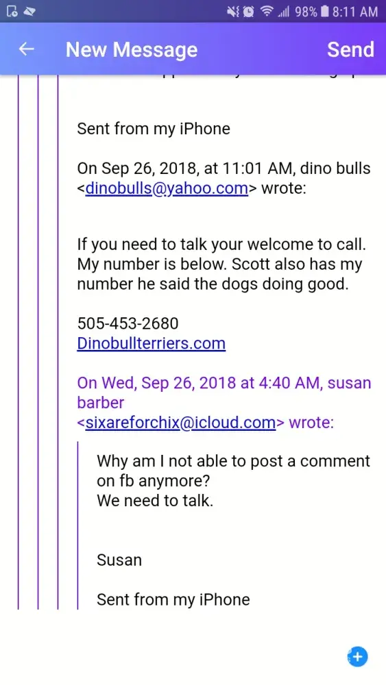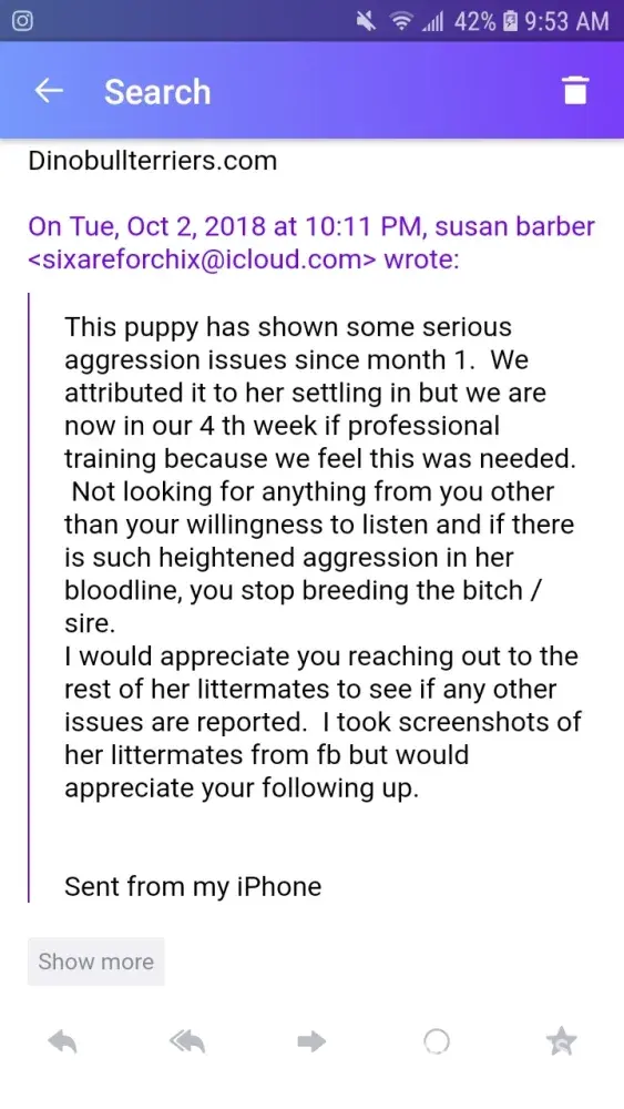 Gathered the emails Susan sent me. Notice I responded to all of them! Also notice Scott's not coming to me she is. It took her 4 months after I sold her this dog to notice I blocked her on Facebook. Then a month later after she notices shes blocked on Facebook she starts emailing me about aggression issues. Not a coincidence huh lol! Then she has failed to post proof of the training she claims the dog got on here. If anyone wants to see her criminal history in regards to this complaint please contact me!