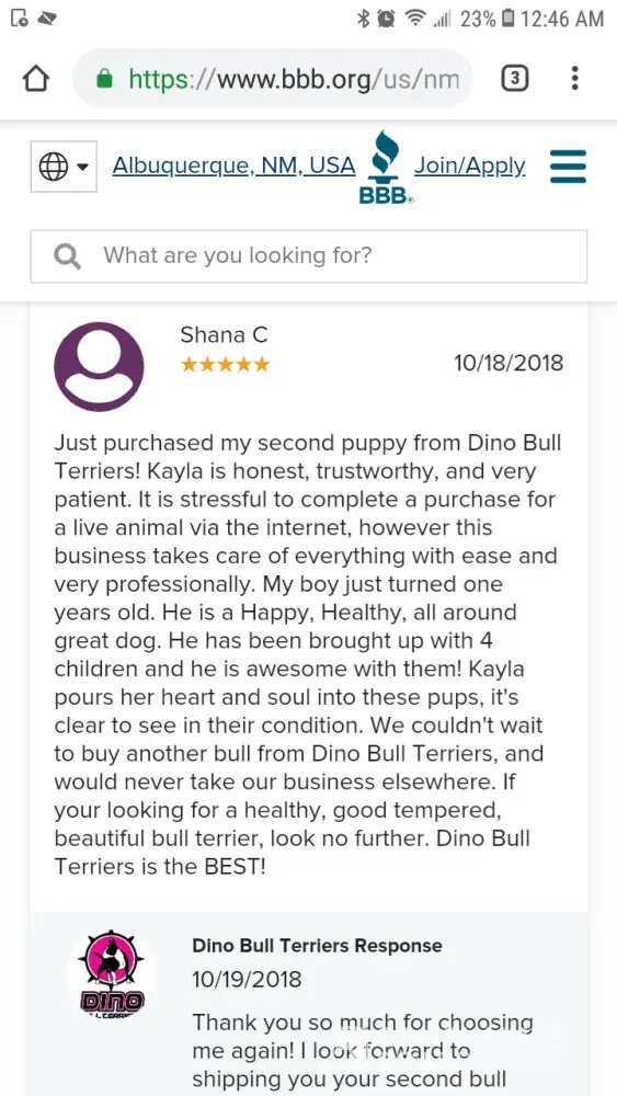 The person behind the screen is Susan Etta Barber age 50. She is the girlfriend to one of my former customers Scott Jones. More simply put she is not a customer of mine. I can't even believe I'm entertaining this review but you know what this type of story needs to be heard by anyone that comes across this review. So in 2016 I get a call from Susan Barber to chat about available puppies. She then goes on to waste hours of my time just to end up buying a cheaper dog from another breeder. I actually know who the breeder is and will not mention her name out of respect. She also had posts about the breeder on her social media saying that the dog she got from the lady had foreign objects in it's stomach and she was going broke taking it to the vet. She later removed those posts from her social media after Scott purchased a dog from me and I later confronted her about it when she started giving me problems. Keep in mind, around this time a competitor of mine decided to slander me online. My domain search was actually clean until that happened so this why you see Susan here following in my competitors footsteps because she is not a customer Scott was. Therefore, the BBB won't entertain her lies. Anyway, after her 1st initial contact in 2016 Scott waits 2 years to buy a puppy from me. During these 2 years Susan is following me on social media & Scott would message me off and on to inquire about available puppies. Eventually I get a call in June of 2018 from Scott Jones wanting to see a puppy I had available. While talking to him he expressed he had 2 bull terriers one a rescue and another from a breeder I mentioned earlier in this discussion. He also made in clear he was very experienced with the breed. While on the phone with him arranging the purchase, Susan is in the background yelling, " PUT HER ON SPEAKER PHONE I WANT TO HEAR WHAT YOU GUYS ARE TALKING ABOUT" her voice was not calm and polite when she said it either. She yelled it in a jealous dominating tone. This immediately should of been a red flag to me and I should of terminated the phone call right then and there. I will admit in the past I liked the challenge of these type of customers and would take them on simply to prove a point & when they had mentioned they were a little doubtful because they had ran into the forum my competitor wrote I kinda felt obligated to prove their doubts about me wrong. Anyways, Scott decided to buy the dog after continuing to low ball me in past inquiries through social media. He then invites me to his property in Rio Rancho NM. I get to the property & at that point was rudley greeted by Susan. She said nothing when greeting me instead she had this bitter look on her face. Also while I was at Scotts and Susan's place. They both drilled me with temperament questions the whole time. This confused me because as mentioned before they owned 2 bull terriers at the time. After answering numerous temperament questions, which my responses were not sugar coated, Scott then walks around aliasing the puppy while susan begs him to give me the money like some sort of child. He then tells her to " hold on it's in my pocket." At that point that's when I knew she was in fact not paying for the puppy. He then handed her the money to give to me. While counting the money, Susan is making side remarks that the puppy looked like a chihuahua. Again at his point I should of terminated the sale but nope. Again, I no longer deal with people like this anymore. People that belittle me in anyway will be asked to GO FIND ANOTHER BREEDER. Furthermore, the sale was later completed and I left. Not even 2 days later after selling the puppy Susan comments on one of my social media posts that the customer getting a dog shipped to Atlanta should, "come pickup the puppy instead." She also made sure to write the comment in all CAPITAL LETTERS too. I then blocked her from my social media. I also think it's rude when customers try to micromanage by business and I have found nothing good ever comes from these type of clients but extreme entitlement. Susan then emails me at 4am a week or so later saying " we need to talk. why did you block me off of social media?" I then ignored that email. I then get a call 8 months later while I had a litter of puppies from a lady by the Kathy Finley saying Scott had referred her to me because him and Susan were impressed with the quality of my puppies. I then sold to Kathy and she has not contacted me ever since with any issues. Days after Kathy took home her puppy, I get another email from Susan saying the puppy had aggestion issues, she wanted nothing from me, and wanted to keep the dog because she supposedly had it in training. She then goes on to demand how she wants me to stop breeding and has screenshotted all the siblings to her puppy from my social media. I then contacted Scott immediately but my text messages and calls went unreturned. I called Scott and not her because she was obviously not the one that paid for the puppy. So her allegations stated in this review that her attempts were disregarded is a lie. In fact, I had just texted scott days prior asking him how the puppy was and thanking him for the customer referral. Please reference the screenshot for proof. She then went ghost on me for 6 months until I got another email from her asking if a bull terrier she found was possibly mine. I then chuckled while reading the email and ignored it. It is now currently July 2019 and I get a notification from the BBB saying a customer left a review. I then go check my account and sure enough it's the devil herself Susan Barber. She left a review not a complaint 1year after Scott bought the dog saying I was unethical for not standing behind my aggressive breed. That review was never posted because the BBB found out she indeed was a lier. I knew I did nothing wrong to this women so I warned her that if the bbb decided to post the review I was going to do the same to Scott's business. I actually contacted sc