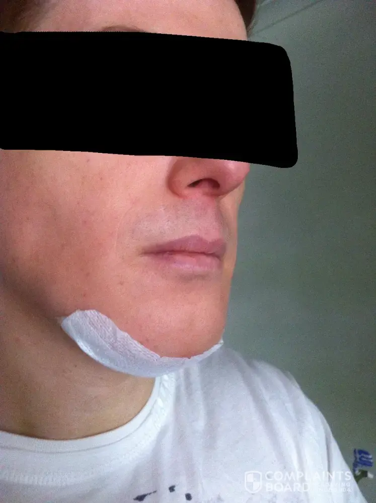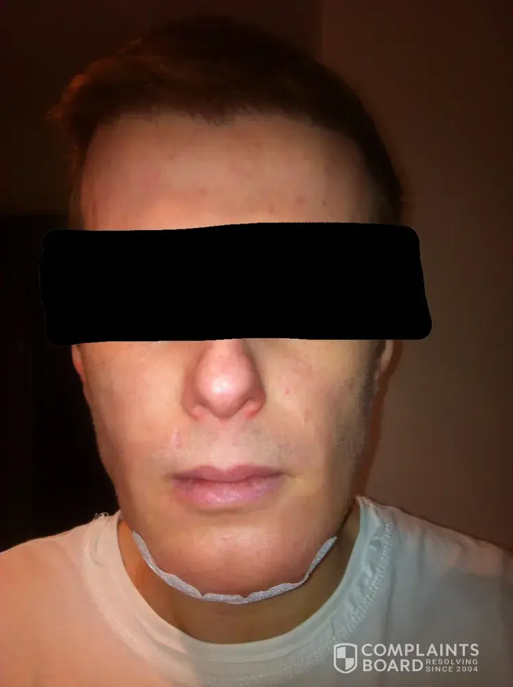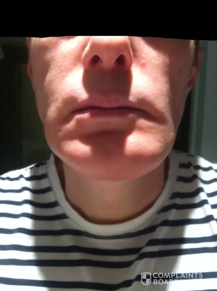 Dr Ross affixed a chin implant entirely on top of my chin rather than around it (according to the hospital report written by the independent removing surgeon), and it was attached to my face 1.5cm off centre (again, according to the hospital report). This resulted in: