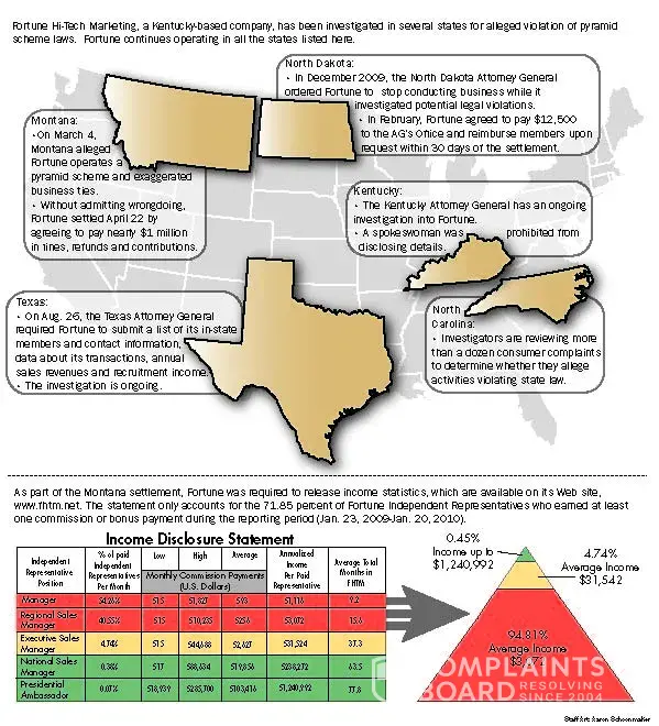 Another State Attorney General is investigating Fortune Hi Tech Marketing (FHTM) as a Pyramid Scheme. At some point, the reps in the field are going to become weary of the story about several former attorney generals saying everything is OK at Fortune. North Carolina is the third state in a very short period of time to investigate FHTM. Having 2 old ex Attorney Generals and an ex Reagan AG on their staff has not made them nor kept them legal. In North Carolina the consumer protection laws are very clear: If you charge to get into the business or pay anything as a bonus for recruiting (regardless if products are sold) YOU ARE ILLEGAL!