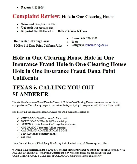 Hole in One Clearing House reviews all over the Internet are deplorable. Do Not get involved with his associates GTAA Golf Tournament Association of America Leader board and many others. Dennis Chase Owner Works out of a PO Box in another state