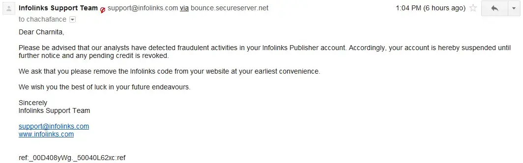 You will see the email that Infolinks sent me below. I had their "code" installed on my website for about 3 weeks and for 2 of those weeks I was offline (Internet service was cut off). They claim that I had fraudulent activities going on, but never explain just what these activities are. I did not do anything wrong. I did nothing "fraudulent" on my website and I never would. I have been using other ad networks for YEARS and none of them have complained or treated me this way.