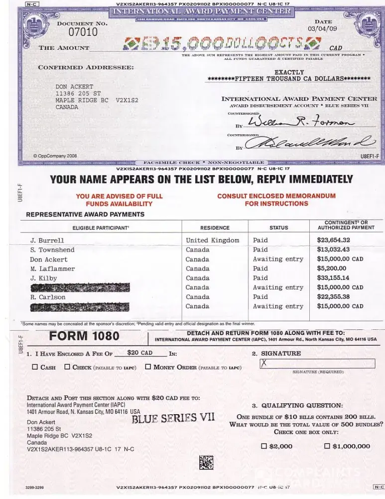 My husband recieved this today the form 1080 request a $9.00 fee in cash, check or money order . Yes it ask for cash... sounded suspicious therefore when I went on line I found previous contest from this same Company asking for a $20.00 fee and the series was listed as Blue series VI so we knew it had to be a repeated scam.