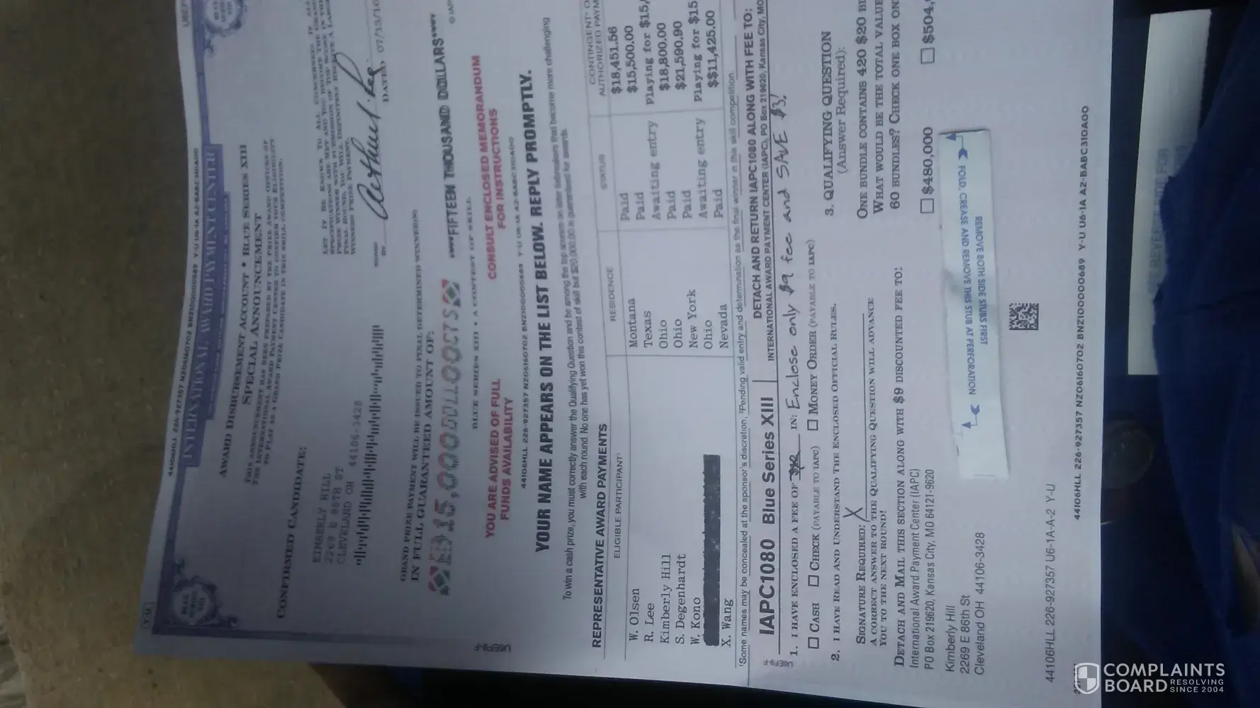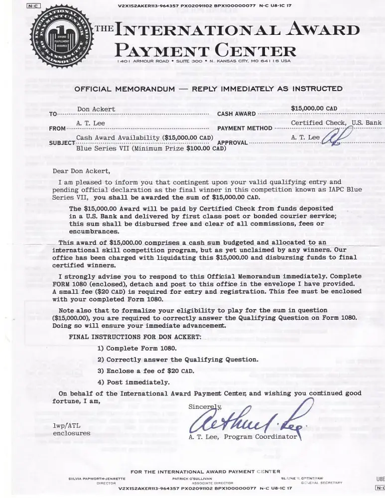 Received a notice from Corporate Headquarters International Award payment Center 1401 Armour Road North Kansas City, MO 64116 USA in regular mail. Has Id #ENV-188-FC also says computer tracked. Date on envelope is date 2012 time 10:08 Has check made out in my name Helen Cook 55 Slow hand Drive, Hughesville, Pa [protected] for 15K. I am unable to make out who signed it to endorse check. Requesting I pay a 9.00 fee and they ask what they call "a qualifying question" One bundle contains 450 $20 bills. What should be the total value of 30 bundles? check box below answers is either 270, 000 or 405, 000. Stamped on part that I am to answer this question is in large bold print "BLUE SERIES XII" AT THE BOTTOM OF THAT PART AS WELL IS A SERIES OF NUMBERS AND LETTERS: 17737COK [protected] U5-1A-1-1 N-U Signature is Arthur T. Lee Hope this helps to put them in prison for fraud. (my email is [protected]@windstream.net) Thank you for your help.