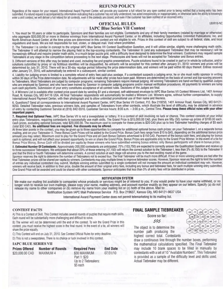 Intelligent and detailed answer; read all: I have been sent multiple letters. One asked for a fee to add into another contest but could be returned with no money. The second requires a discounted price of $9 for registration. Whoever went off about this not being a scam is partially correct. Legally, they are doing nothing wrong. As long as they can make record of winners for those deadlines, suggest but do not require a fee for sweepstakes and when requires a fee, calls it a contest (such as the $9 fee for the puzzle contest)(sweepstakes are purely chance whereas contests require "skills"). This is why when you google it, there are complaints going back for years. They have a bad rating with BBB and have been stopped in certain states for breaking those states specific rules but will not be facing charges anytime soon. So legally, they are fine. Ethically, they are horrible people and should be ashamed. They are doing everything just over the line of legal and tend to prey on seniors and disabled. They purposely try to fine print the real information and skirt right outside the legalities knowing there are people out there that do not have the capacity or knowledge to know what is real and what is not. My suggestion to anyone who receives these mailings is to send a letter to: Notification System, IAPC Mail Preference Service, P.O. box 219637, Kansas City, MO [protected]. Specifically put in the letter to (a) do not release my name and email address to other companies (b) remove my name from your mailing list or (c) remove my email address or (d) all of the above. Make sure to copy your name, mailing address and account number exactly as appeared on the letters you receive from them. This is equivalent to registering with the national do not call list or unsubscribing from an email list. That is the most you can do unfortunately.