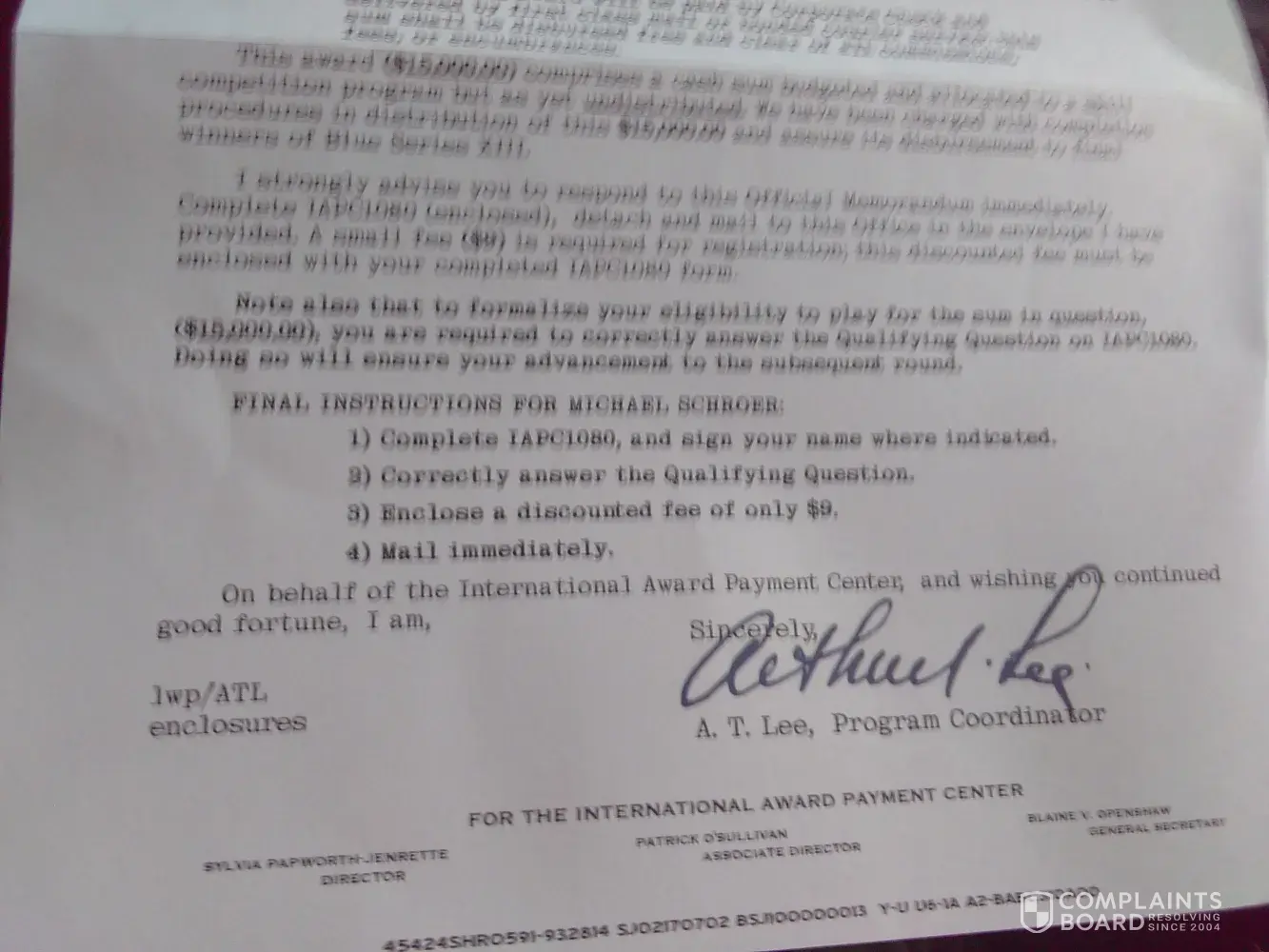 Received a red courier express envelope from Arthur Lee at the corporate headquarters stating if I send $9 dollars registration fee and give an answer to a question I could advance to the 2nd round and receive $15, 000. I wonder if they exist an have ever rewarded anyone anything or just take $9 from millions and just pocket it.