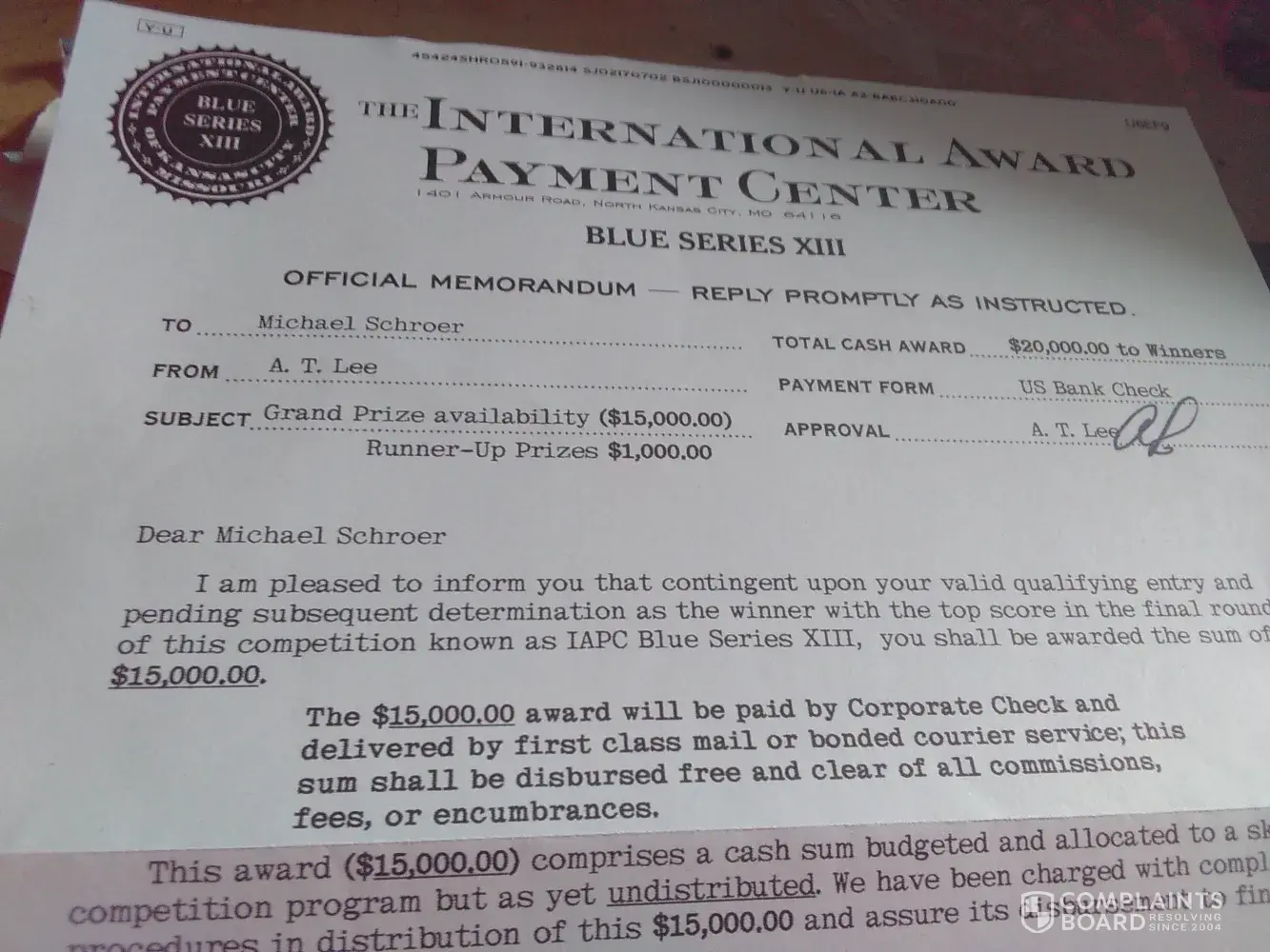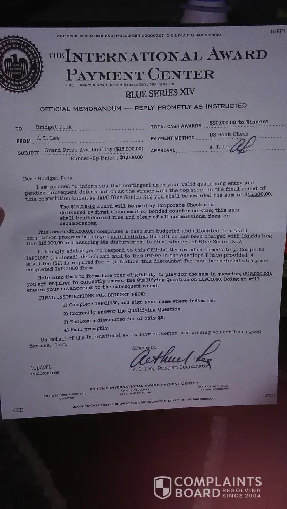 I received a courier envelope today from the Company above, listing their address, to submit return Form and cash, check or money order for 20$ to : International Award Payment Center (IAPC) 1401 Armour Road, N.Kansas City, MO 64116 USA. I know you have laws to deal with these lowlife types and hope this letter helps you charge the people running this scam.: Contact me at: [protected]@hotmail.com