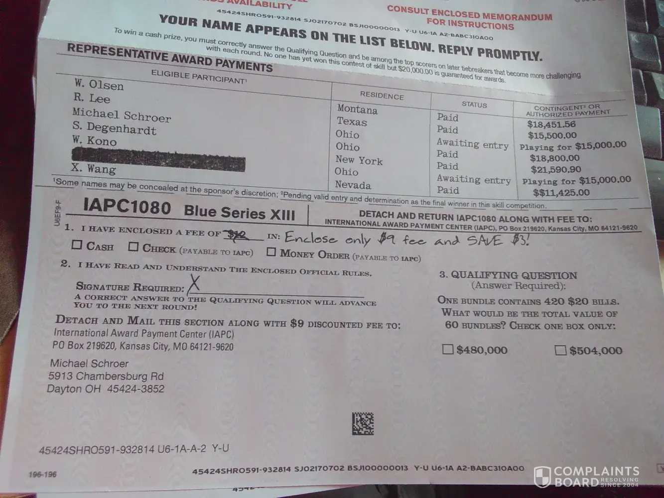 Yup so do I folks. 'Just receive a letter from IAPC dated June 6, 2016. It's dressed up as a skill competition program asking me to answer a simple math problem. It's so simple that you don't even need a calculator to get the correct answer. It is asking for a measly registration fee $9 ($3 discounted) as one of the requirements. If I answer the problem correctly, I will be now moving to the 2nd round then I wouldn't be surprise if it will ask for a much bigger fee. I was so suspicious that I googled up this firm's name only to find tons of scam reports. I wouldn't be surprise if someday (hopefully sooner), the FBI will come knocking at its door.