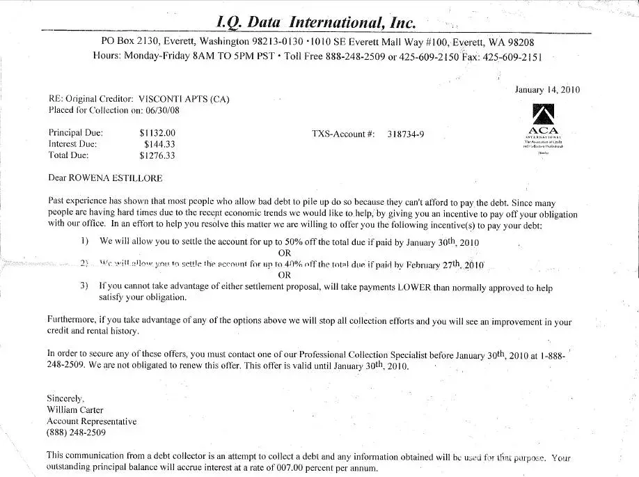I wanted to go to small claims court because I really never owe them anything and it was not my fault but I was in the Bay Area and the hassle to go to Southern California and the money I'm gonna spend is not worth it. There was a company named IQ Data, on their behalf that kept calling me and wanting to collect the money. They send letters that if I pay half of it, it would be solved and it would be removed from my credit report. I paid half of it so it would be removed from my credit report. Since then until now, it is still in my credit report and had not been removed. Until now, as of July 18, 2011 there's another company calling me and collecting the money which I said I already paid.