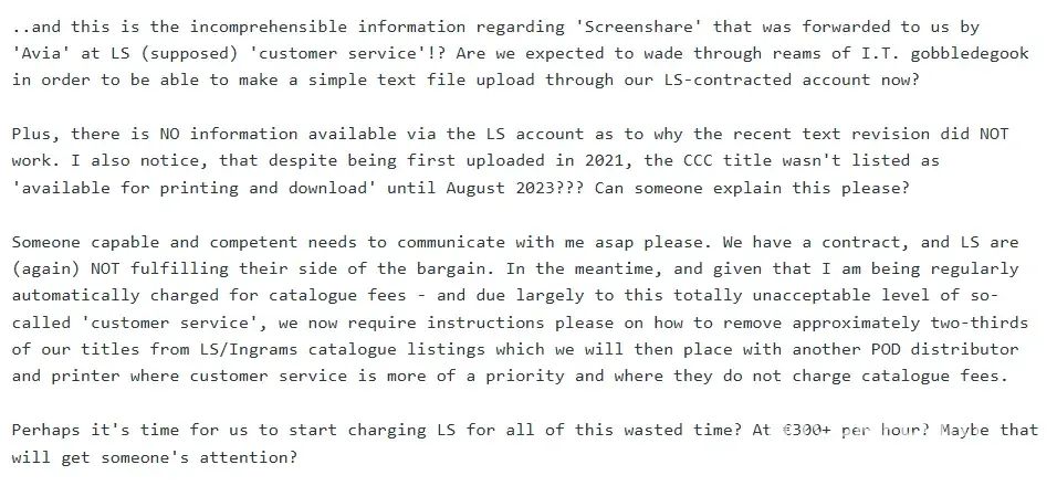 Terrible, awful customer service! 20+ years with Lightning Source and over 120 titles later, we now feel compelled to warn other authors and publishers that L S UK (in particular) - as well as LS USA in Tennessee it seems, have abandoned any and all sincere efforts at proper customer service. At one time you could call or email your Account Rep. No longer. Now it is voicemail, "Because everyone is in a meeting" or "The Team" will get back to you in due course. Which mostly, they do not! When one eventually gets through to someone (we had to contact their Legal Dept in the USA to simply get someone at LS UK to respond to us) only then to be served up a string of vacuous, unhelpful and utterly useless 'directions' that did NOT deal with the issue at hand. In this particular case, all we were trying to do was upload a new text interior PDF file (with a couple of typo corrections) for an existing book. Two months and several attempted 'communications' with variously non-responsive, inept, poorly-trained and/or disinterested-and-condescending supposed 'customer service staff'... this simple task (which used to be easy via the website) still hasn't been done! In utter frustration and exasperation at the lack of competent or timely responses, and in an email headed, "What on Earth is going on at LS?" ..we finally asked for instructions as to how to remove 2/3 of our titles from their database, and who we should bill for all of our wasted time? That was over a week ago and STILL, no response or acknowledgement!? Meanwhile of course, they continue to draw funds from our account for purported 'catalogue fees' and, despite us having signed contracts, LS has unilaterally changed the standard requirements for printing and distribution at the behest of the Big Boys (Amazon et al) so as to effectively deny small publishers access to their contracted services unless we pay ever-higher fees and surrender up-front discounts on our titles beginning at a minimum of 40% per title, and even suggesting that up to 65% will better help sales. (It used to be 25%). In short, Lightning Source UK and USA - a subsidiary of Ingrams - appears to have gone the way of all corporate entities who invest in the 'savage capitalism' model that prioritises profiteering over customer service. In fact, it appears that it is a deliberate policy decision (just like so many other corporate behemoths) to maintain a deceptive PRETENCE of customer service so as to secure your initial confidence and trust, only then to give you the eternal (anonymous) runaround once they have your titles and fees 'in the bank'. Because where's the profit in dealing one-on-one with LS-created customer service problems, when they can just redirect pesky enquirers into a never-ending cycle of automated generic responses? My respectful suggestion to anyone who is considering partnering with Lightning Source in face of all of these negative reviews, is DON'T! They were a decent operation at one point. But no longer. Put simply, they are NOT fulfilling their contractual obligations to their customers and partners - and that is actionable under law. Any company that treats its partners with this level of contempt and disrespect needs to be boycotted - at least until they wise up and reassess their priorities. If however, you do decide to use them, please make sure you warn them in advance (by personal contract) that any failures or lapses in customer service that cause you stress and frustration and/or that cost you time and money WILL result in them being invoiced. THAT seems to be the only thing that concerns them these days. Dr Stephen T Manning author of "CRISIS, CULL or COUP? What, How & Who? Facts & Truths to Make You Think!"