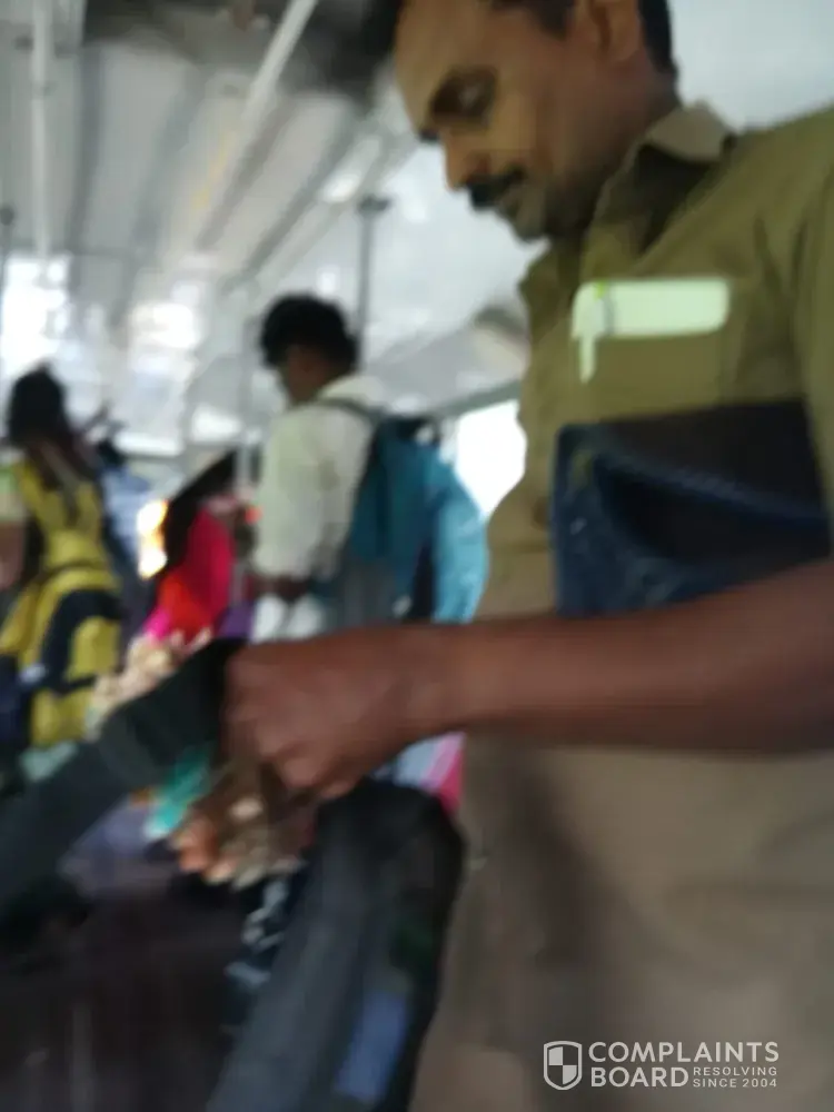 Today I have boarded 91 bus (tn01 n 9634) from vels university stop (chromepet) to chennai one (thoraipakam) at 1.32 pm. As soon as I boarded the bus, I was waiting to get the ticket as I dont have change I gave 50 rs for which conductor spoke rudely and asked me to get the change, if you dont have change get down (change vangitu mela eru, ilena next stop la erangidu). Again I was standing firmly then he got my 50 rs and refused to give the change even though he was having change which he got from other passengers. Also when I asked about my remaining change, he told will give you only at the end of the stop. I asked him he can give the change which he got from other passengers, for which he said you go and get and come from them why should I do? (ni venumna avnga kita change vangi enaku kudu, na yen vanganum) also he gave me the ticket for 13 rs (pallav garden to thoraipakkam) whereas my actual fare was 12 rs (vels to chennai one), when I enquired about this he said, you should ask and get properly. (ni olunga chck pani vangi irukanum, enala la paka mudiyathu) I was shocked, as its his duty to give the proper tickets. Also his way of talk, behaviour was very rude. He started calling me as va, po, next stop la erangu, ni vangu, etc.. He din give basic respect to elderly people or to anyone. I feel much offended by his behaviour and need action against this, so that it wont continue in the future with any other passenger. I have attached the bus ticket and the conductor image where he was holding the change in one hand and rupees in other hand, yet he refused to give it to me unless I reach my destination.
