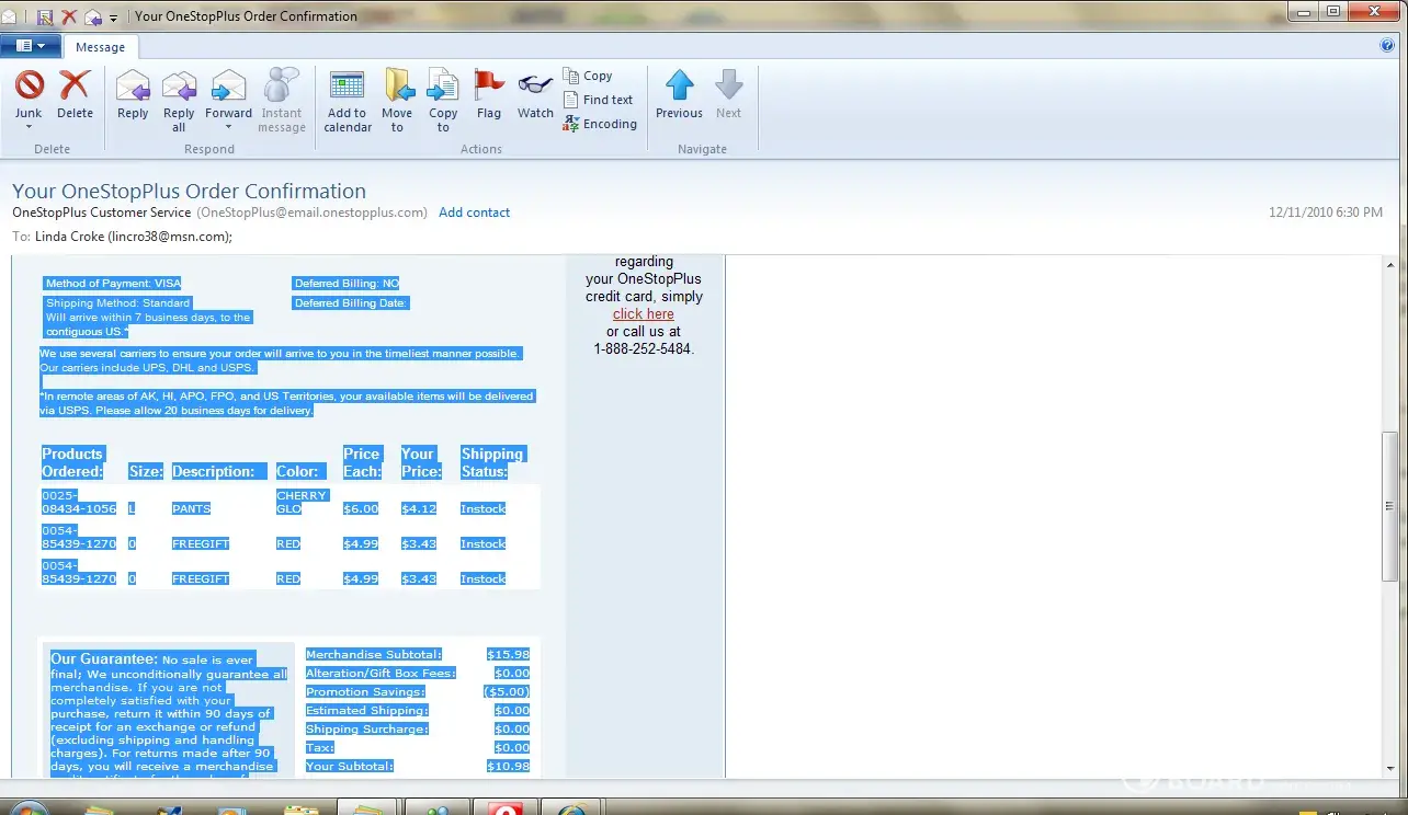 I purchased 2 snuggies and a pair of pants. One snuggie was actually sent to my mother. I waited for my order to arrive and nothing. I contacted by email and got this stupid email that said check online. Even when i did it stated the order was in process. So i waited again. Yesterday i checked again and sure enough still says in process. So i called and now i am told that i used a promotional code that was from chadwick and they weren't honoring it. SO instead of emailing me and notifying me of this issue they just decided to cancel the order without telling me. Now i shouldn't be mad because my mother got a free snuggie but i am because this is bad business. If there is a problem with an order then you call the customer and help them decide if they would like to pay the difference or cancel the order. You just don't tell the customer... I will never purchase from them again. BAD CUSTOMER SERVICE!