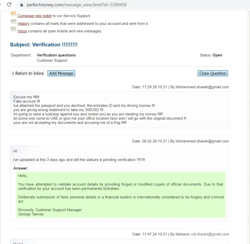 Hi, I've transferred 243.04 USD from IQ option to perfect money web site on 22.10.21, since then I'm trying to make verification to my account by uploading my Passport, Emirates residency ID and emirates driving license with many internal complains and they replied that my account is permanently suspended as I'm frogging my documents!!! They stole my money!!!