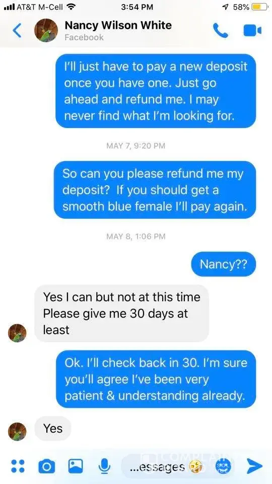 I began messaging Nancy Wilson White in December about a smooth coat blue female chihuahua. She had a litter soon after & stayed she had one. I put a deposit in the puppy knowing Nancy was moving to Wisconsin. After a few weeks I inquired how puppy was doing, she informed me it was a long coat. I stated I wouldn't be getting the pup then. She let me know...