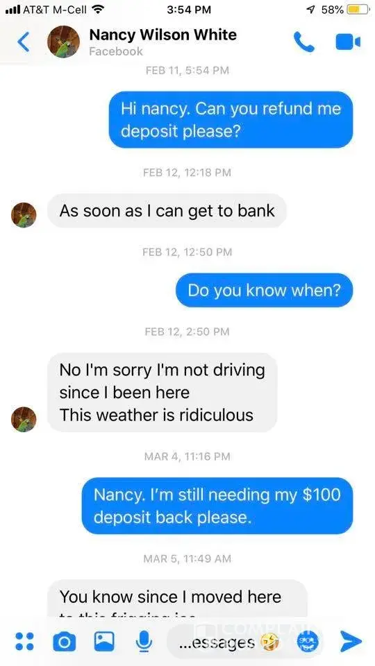 thanks so much i know she is a liar and i posted on her website she took it down also before i could screen shot it she thinks she is slick but god dont like ugly i got my deposit back from pay pal she is one sad, lonely greedy lady, hope that pos rot in hell
