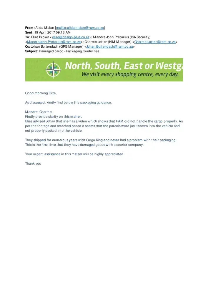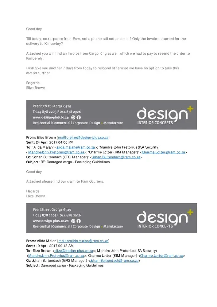 We as a small business company made use of Ram Couriers as our transport company. In March, this year they transport doors and panels to a Kitchen Company in Kimberly which we have supplied for several years. When they delivered the doors and panels it was severely damaged. If you look at the photo’s attached you can clearly see the cargo was not handled...