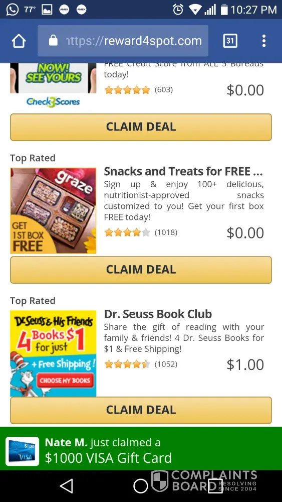 They open a page when I was on my phone. They said that I was elected to received a $1000 Amazon gift card if I acept one of the 3 offers, I have to do it right away before the offer was taken away; I did accepted Dr Seuss books offer, my credit card was charged, I have not received neither the books, nor the $1000 gift card. I have pictures of the offers and all the things they offer. Plesase stop those people scamming, or stop those companies using this kind of ways to get to the costumers. I can provide you with those pics. Thank you very much.