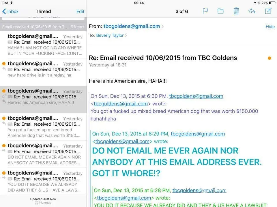 These are screenshots of some of the emails, admission of fraud sent to me by this breeder two days ago. The picture of my dog