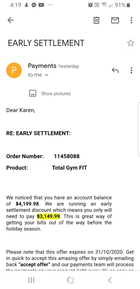 I was told that there was no response to the email so it is now too late to return items. I would have thought if there was no response a follow up phone call should have been made. They can call asking for payment.