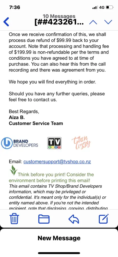 I didn't receive a call or email advising me of a return number. I have had numerous phone calls and emails from Brand developers asking for payment. I have explained the situation and have requested a copy of the said email sent with a return number.
