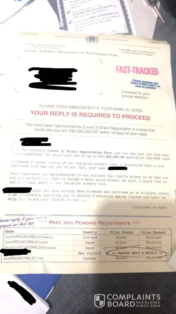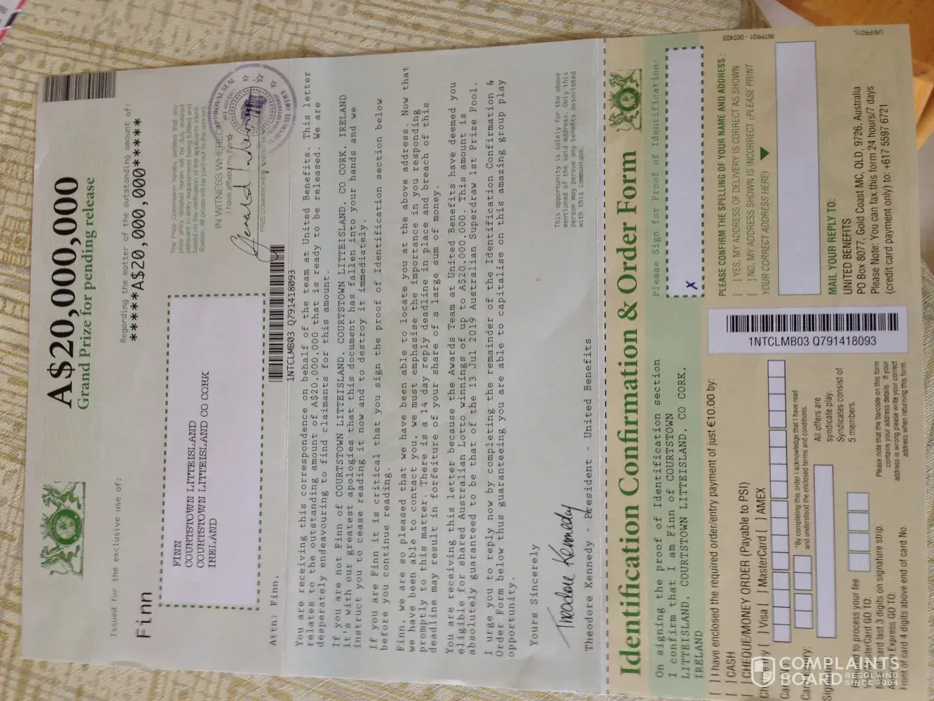 My grandmother Eileen Finn has been receiving letters stating she won large amounts of money and had to send money off in a pre paid envelope to receive her prize. The last letter received was on the 20th May 2019. To date she had sent approx €40, 000. To Theodore Kennedy President of United Benefits Customer Service Network Gold Coast MC QLD 9726 Australia. She should be entitled to get her money back and she would like these letters to stop. Thank you Sharon Finn (granddaughter)