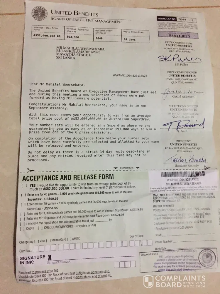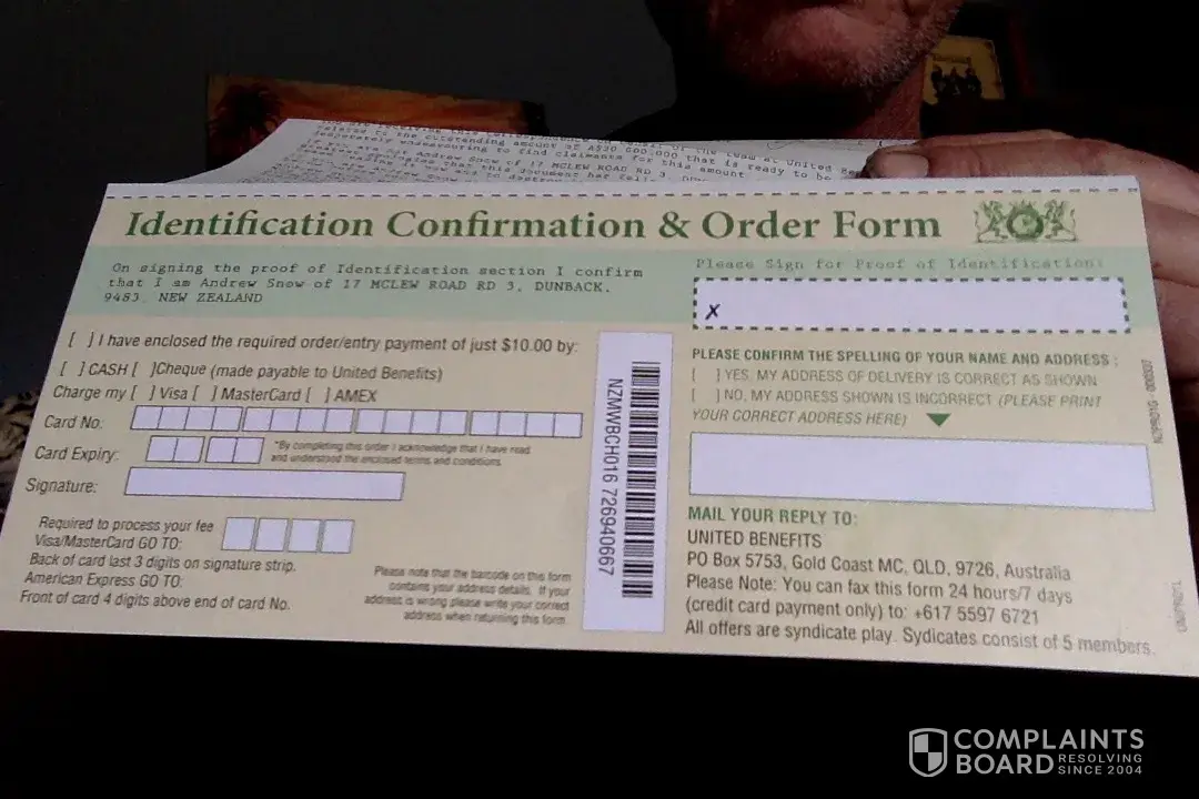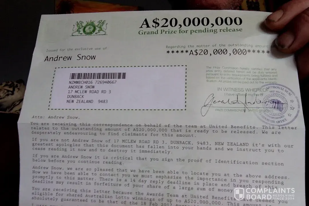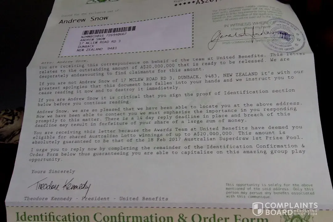 I have also had a letter from United Benefits to my address in New Plymouth asking for $10 for this lottery, so i could have a share of $29 Million dollars. Wish that they would get screwed over themselves.