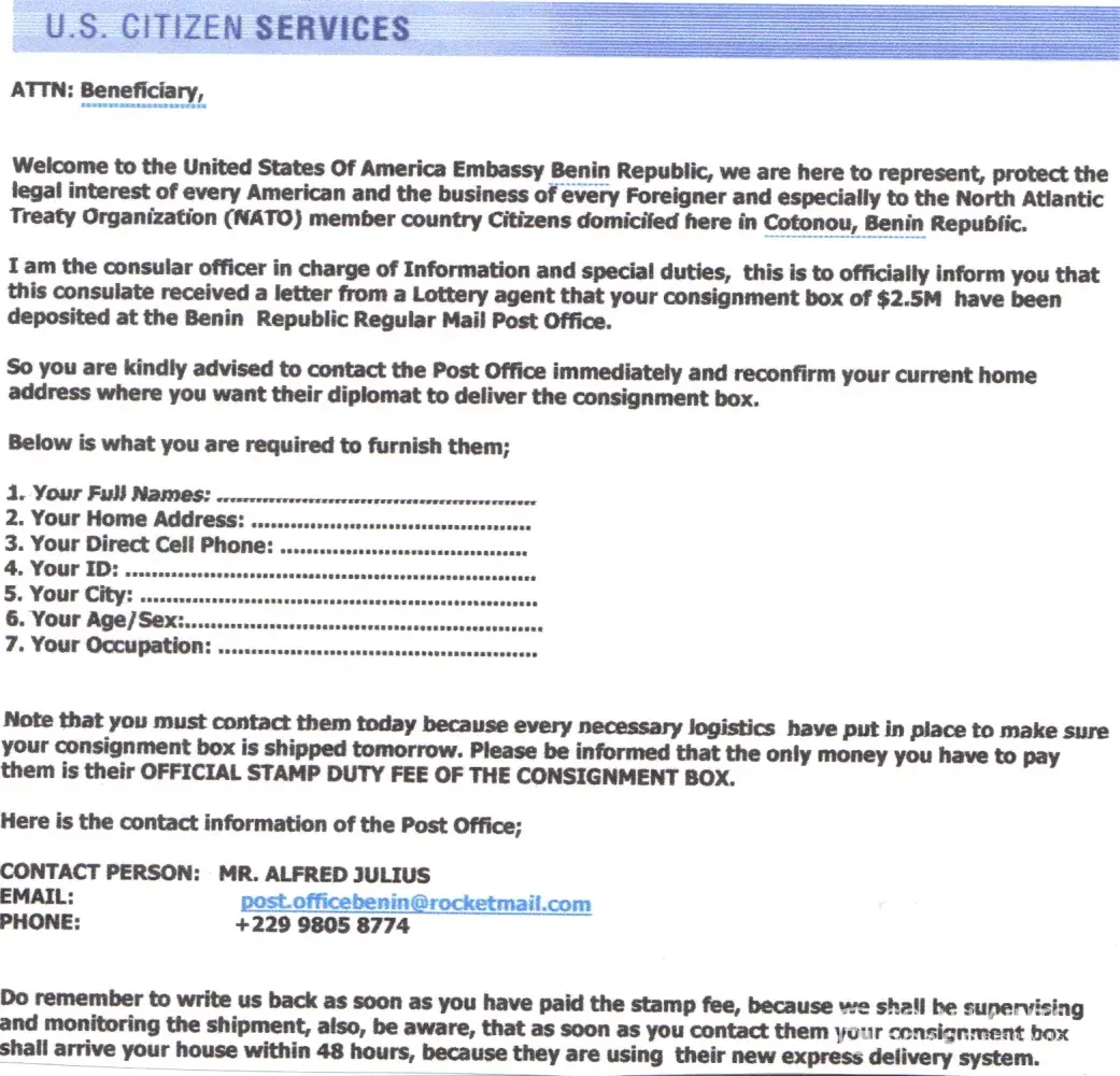 they want me to contact them today because every logistics have been put into place to make sure a box is shipped tomorrow after i pay for OFFICIAL STAMP DUTY FEE OF THE CONSIGNMENT BOX after this is done iam to CONTACT PERSON; MR . ALFRED JULIUS, EMAIL ;post.[protected]@rocketmail.com PHONE; +[protected] also the scam is to make me think i will get money in amount of $2.5M will be deposit ed at the Benin Republic Regular Mail Post Office