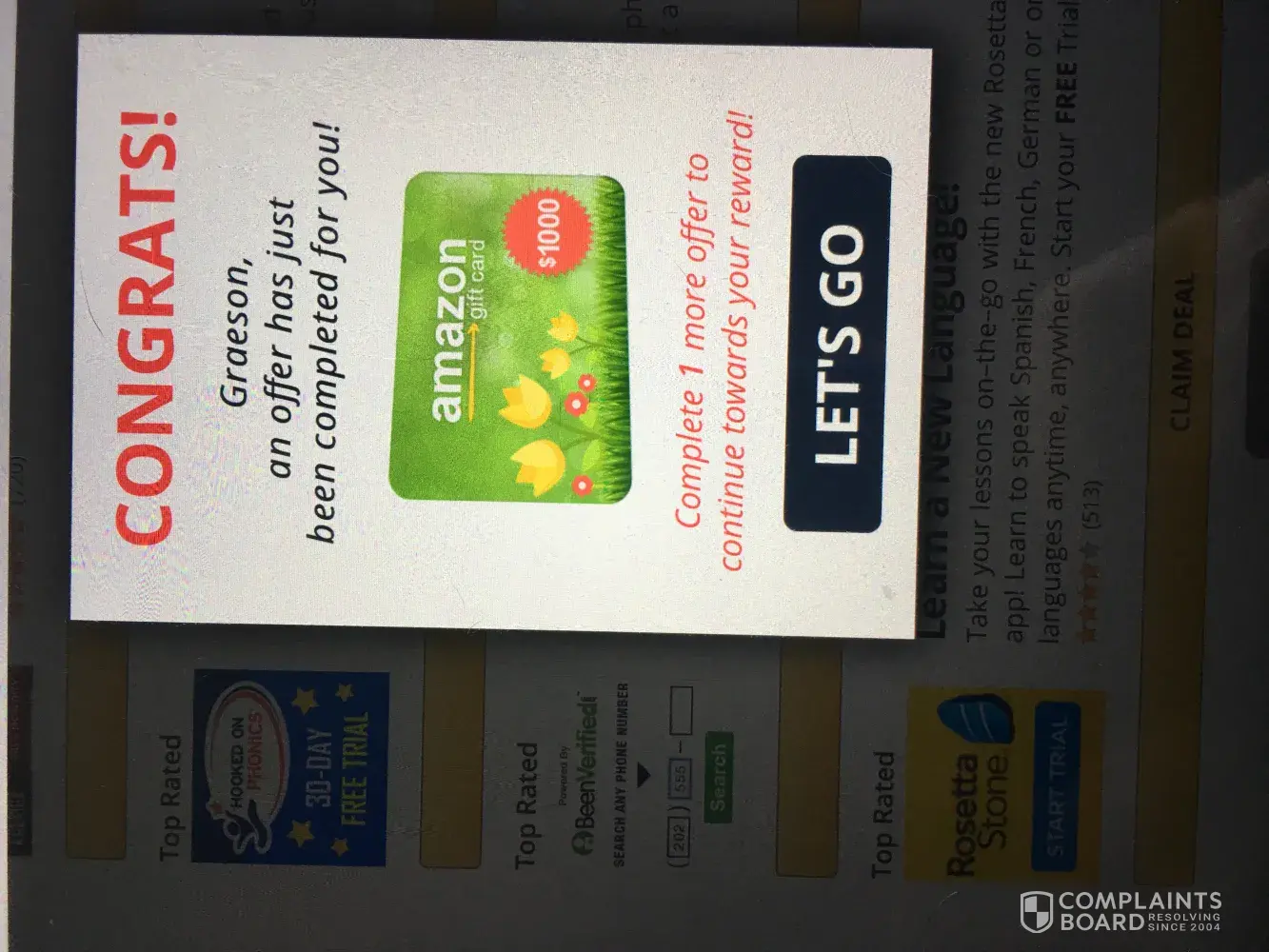 after filling out some offers was allegedly suppose to receive $1000 gift card
