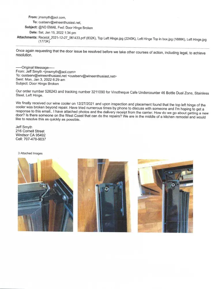 Ordered fridge on 12/7 under order #526243 and was told 7-10 delivery. Fridge finally showed up on 12/27, attached receipt. Upon opening the box, it was found that the top of the door at the hinge was broken, our email attached contained the pictures. Attempted to contact Wine Enthusiast via phone their various 800 numbers but those are useless as there is an answering service that takes down your name, contact information and promises a response within 24 hours, which never happens. Their customer service 800 number actually directs you to send an email [protected]@wineenthusiast.net and allow 4 days to respond, which we did, attached, but you receive a standard response email, attached, directing you to the various delivery companies to follow up on your shipment status which doesn't do you any good when the product has already been delivered. Would not recommend anyone to do business with this company that I would want to remain friends with.