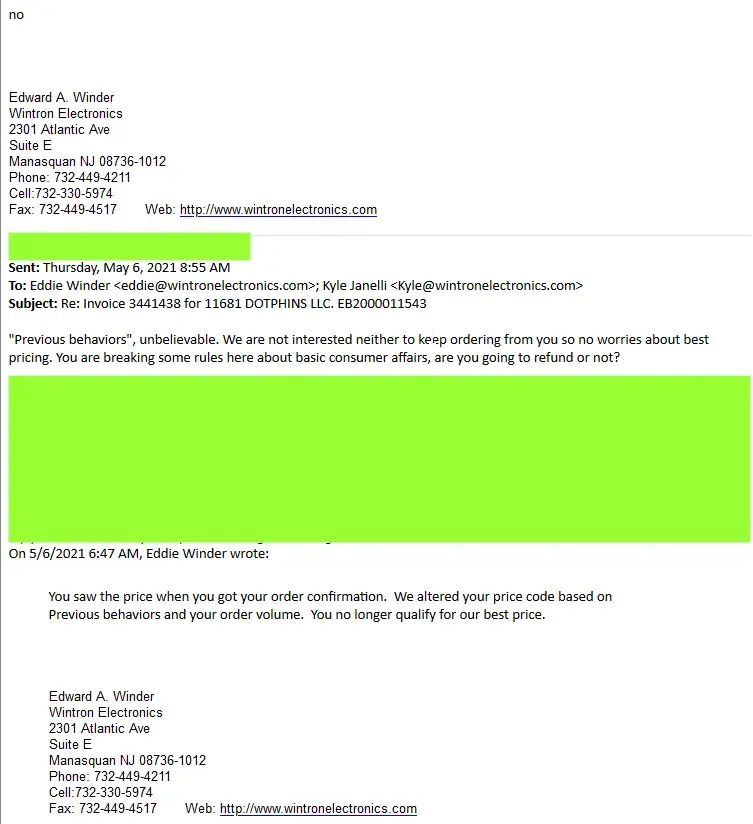 This is my first ever report on here and I am trying to be honest about the whole thing. As a retailer, you want to have good b2b relationships with your wholesalers. Wintron is not the kind of company that wants to hold on to their customers. I was warned by another wholesaler about their practices and now I believe it.