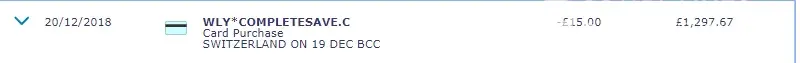 Guys, Please check your bank statement now! That company called WLY*COMPLETESAVE.C -£15.00 (Switzerland). They stolen my money and charged me every month for £15.00 and I phoned to the Barclays bank, the first staff ignored me, and asked me call back 14 days. very rude attitude. then I phoned again the next day another staff are okay, and politely...