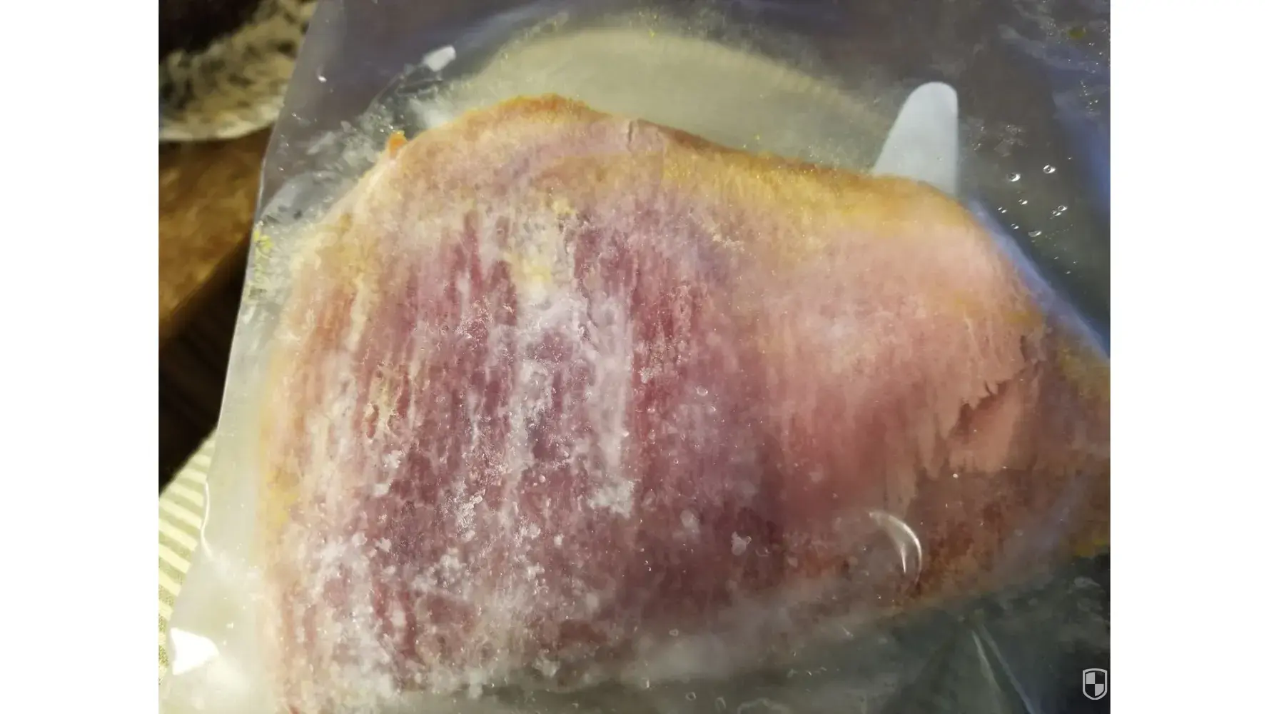 On 12/26/22, I put my leftover Christmas ham in 4 quart size freezer bags and then put those air tight bags into a gallon size ziploc bag and pushed air out for more protection. I got the gallon bag and took out one of my quart bags today and this is what my ham looks like! It hasn't even been a month!
